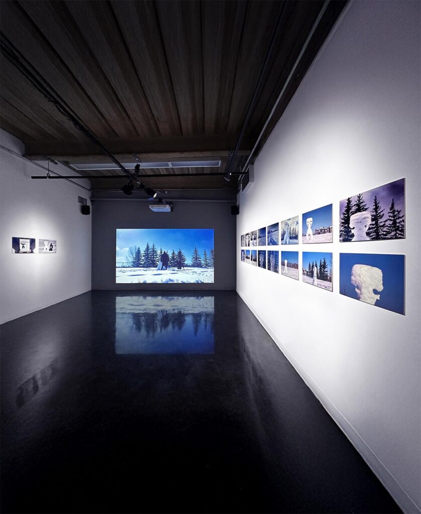 The installation features a grid of digital photographs documenting the snow sculpture from various angles and points of creation, alongside a continuous video projection of the three-hour creation process. The video captures the labor and care involved in reclaiming this cultural symbol, making the audience complicit in witnessing something fleeting take shape, emphasizing the urgency of cultural preservation.