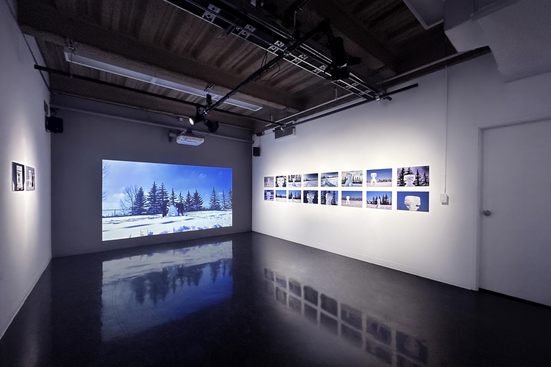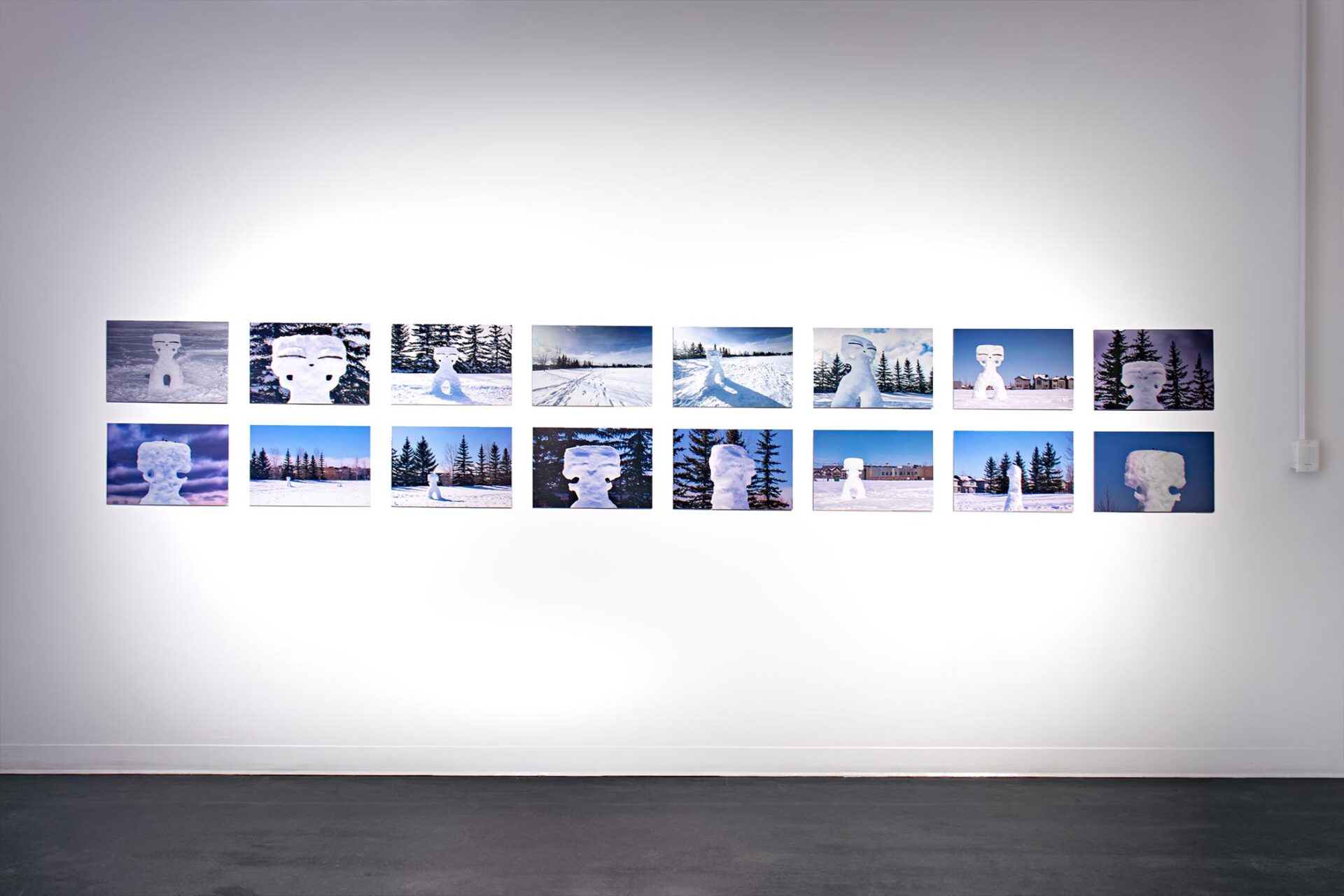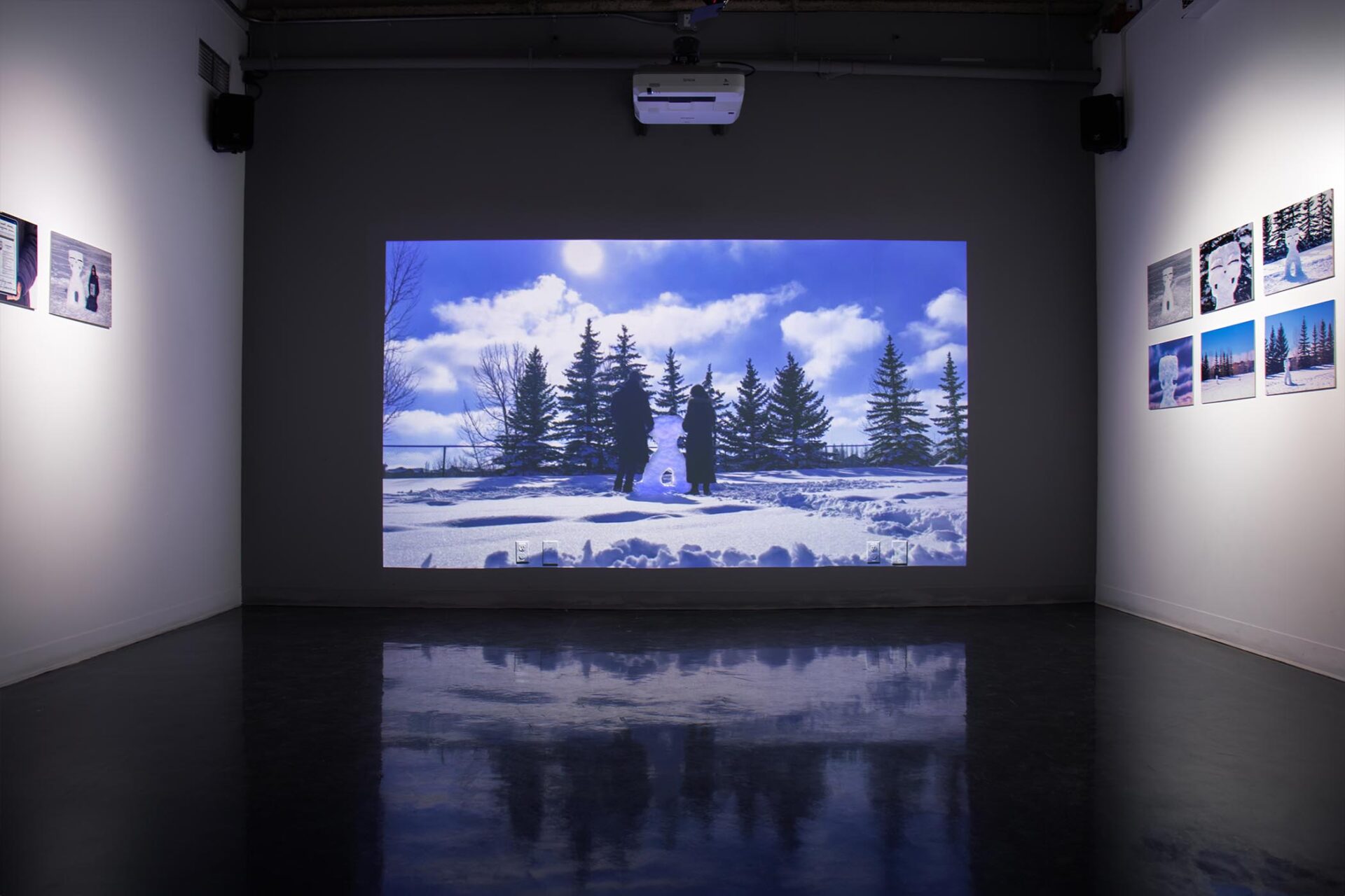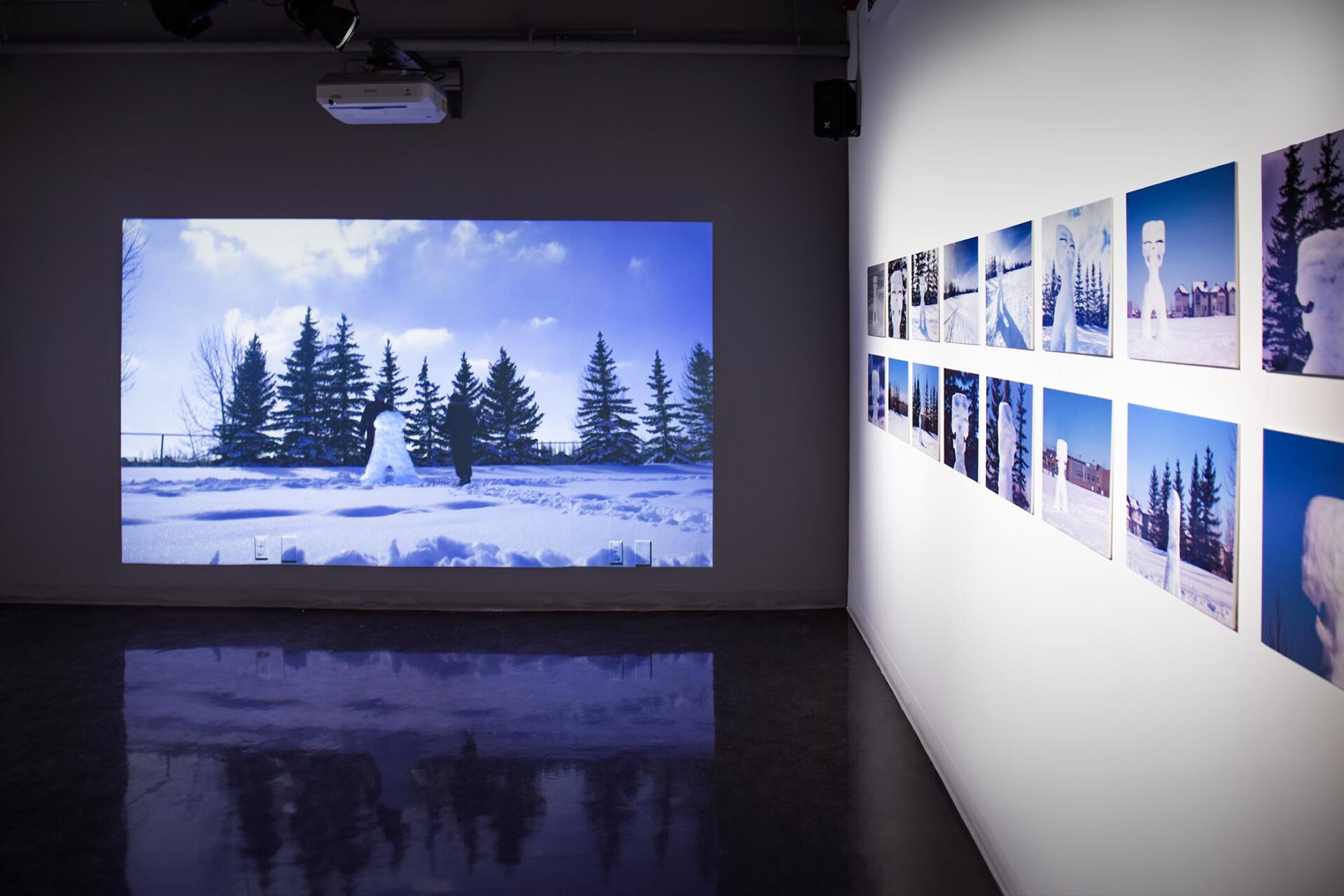 The installation features a grid of digital photographs documenting the snow sculpture from various angles and points of creation, alongside a continuous video projection of the three-hour creation process. The video captures the labor and care involved in reclaiming this cultural symbol, making the audience complicit in witnessing something fleeting take shape, emphasizing the urgency of cultural preservation.