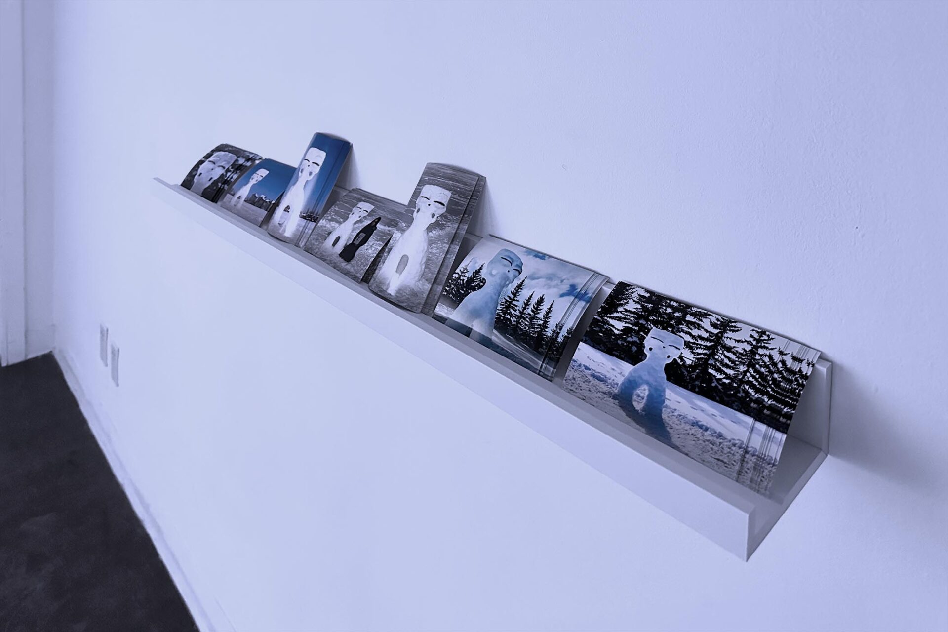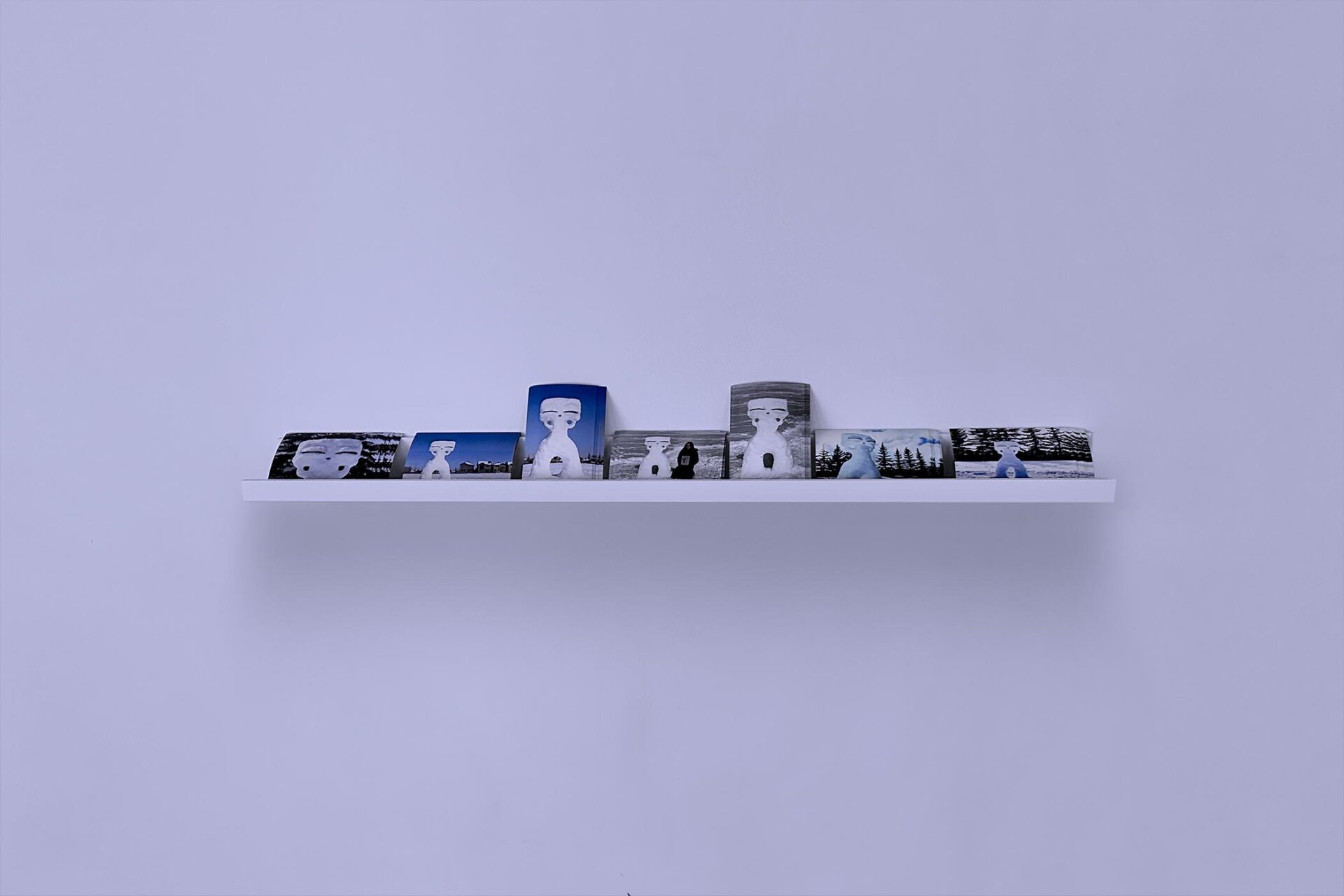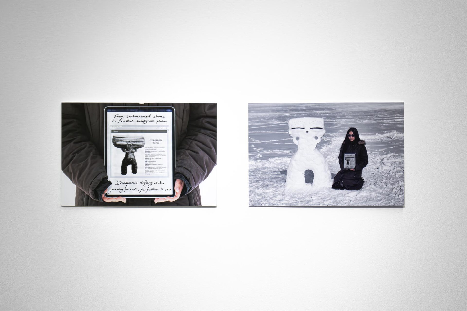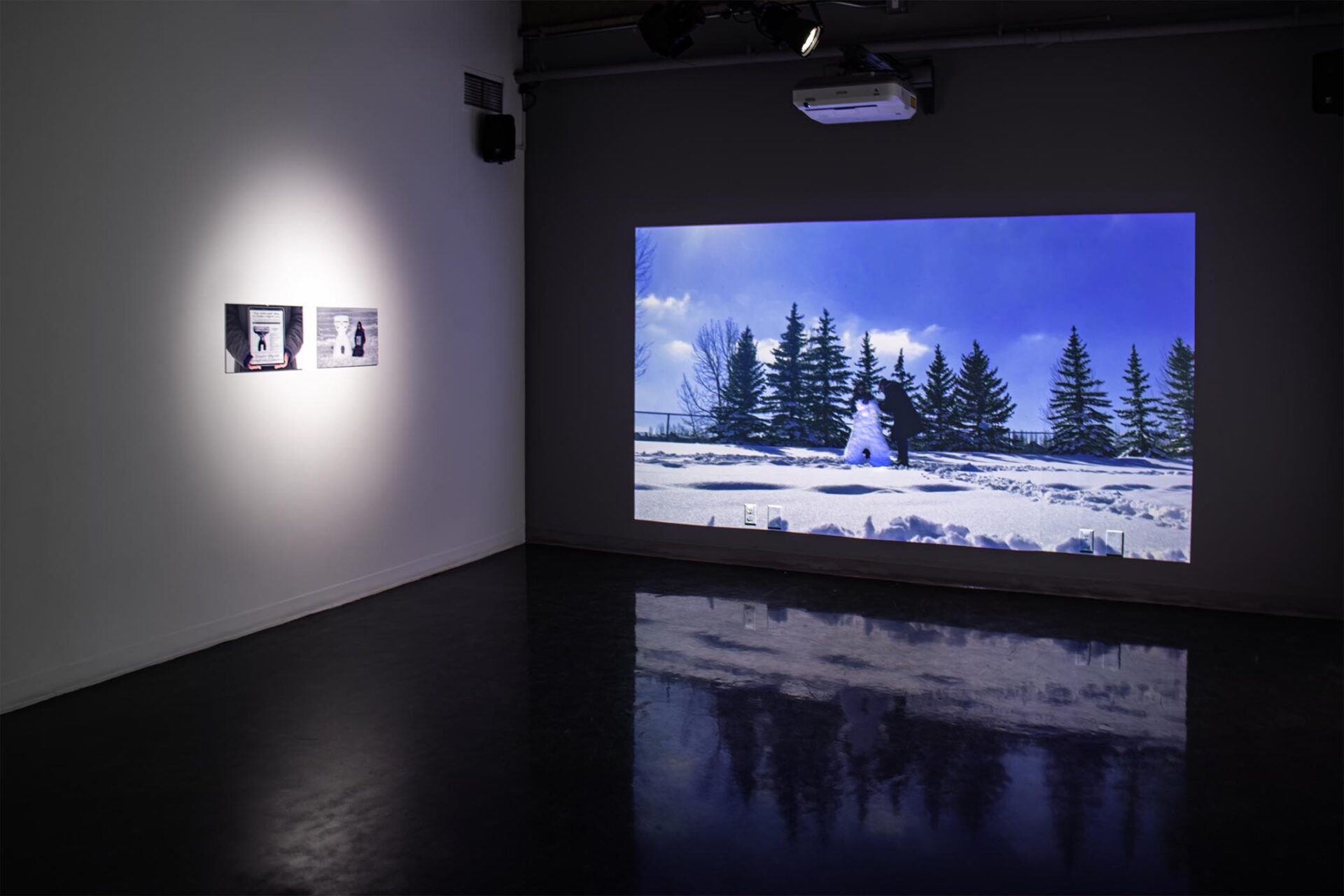 The installation features a grid of digital photographs documenting the snow sculpture from various angles and points of creation, alongside a continuous video projection of the three-hour creation process. The video captures the labor and care involved in reclaiming this cultural symbol, making the audience complicit in witnessing something fleeting take shape, emphasizing the urgency of cultural preservation.