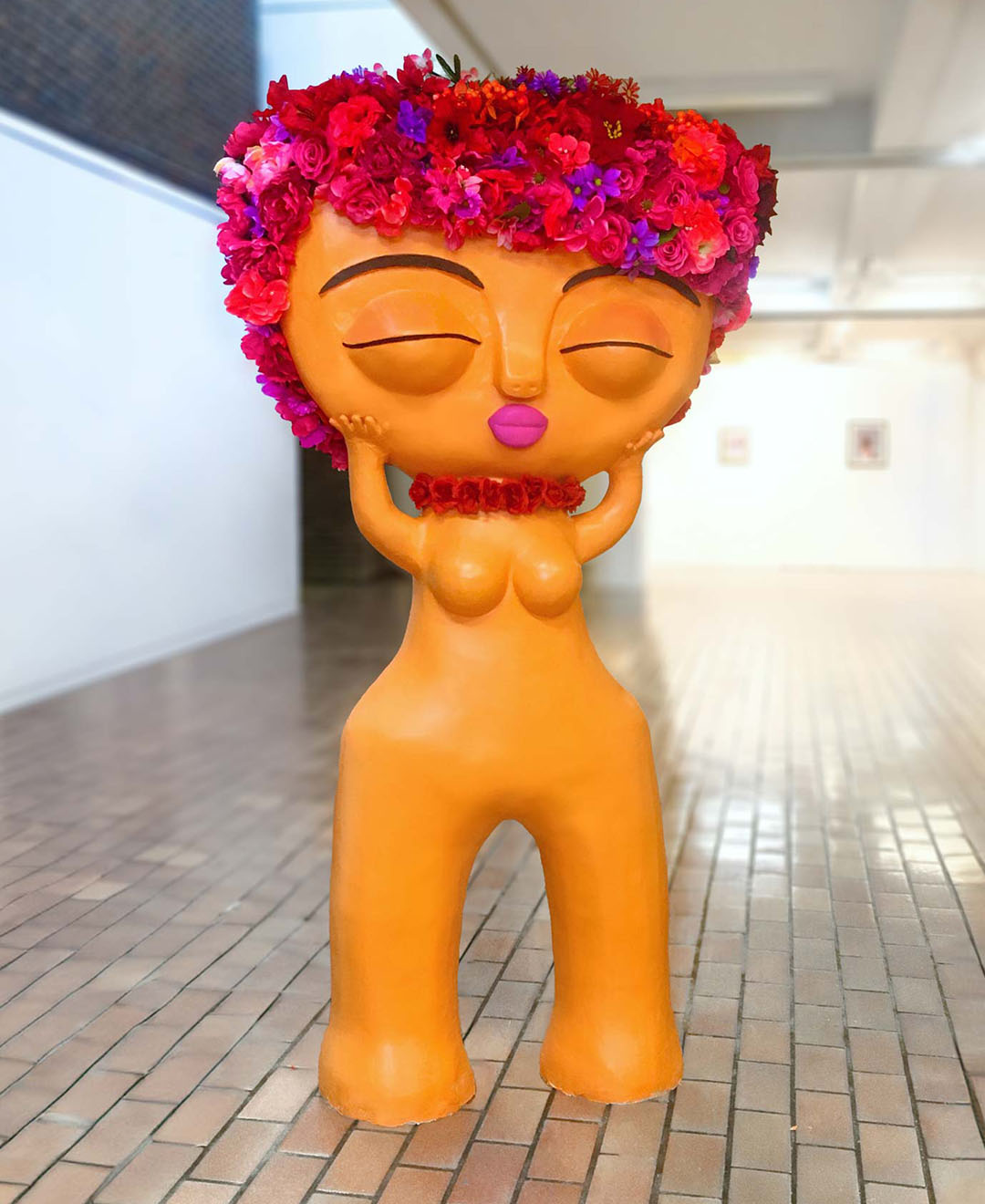 The vibrant flowers and yellow hue that envelop the surface of The (Re)Birth radiates warmth and vitality, serving as a beacon of hope amidst the shadows of colonial oppression. Adorned with over 500 faux flowers rescued from the garbage and gathered from thrift stores, the “Venus” becomes an unabashed cultural revival, each bloom a testament to the significance of finding value in the undervalued, forgotten, and discarded material objects in our lives.