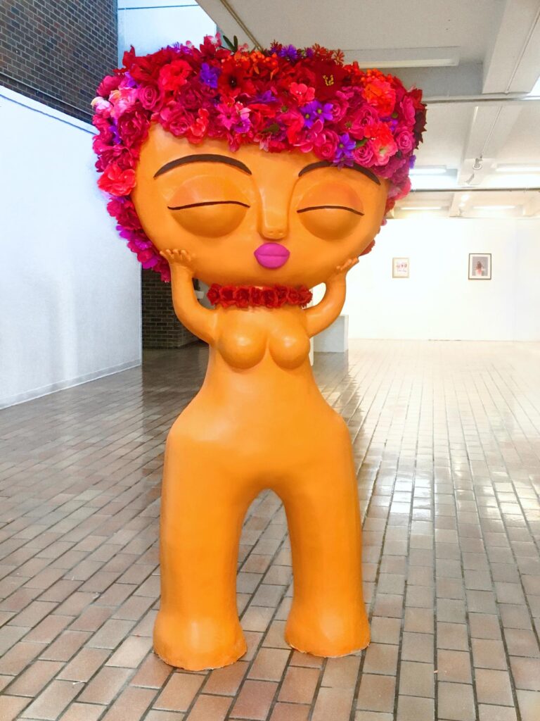 The vibrant flowers and yellow hue that envelop the surface of The (Re)Birth radiates warmth and vitality, serving as a beacon of hope amidst the shadows of colonial oppression. Adorned with over 500 faux flowers rescued from the garbage and gathered from thrift stores, the “Venus” becomes an unabashed cultural revival, each bloom a testament to the significance of finding value in the undervalued, forgotten, and discarded material objects in our lives.