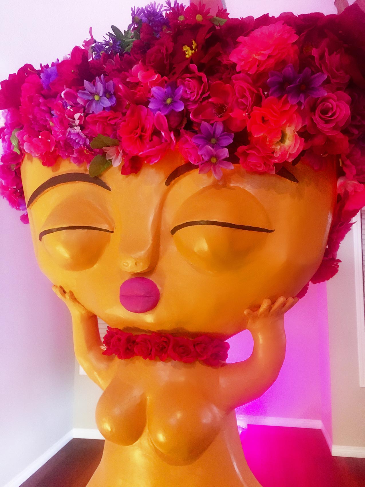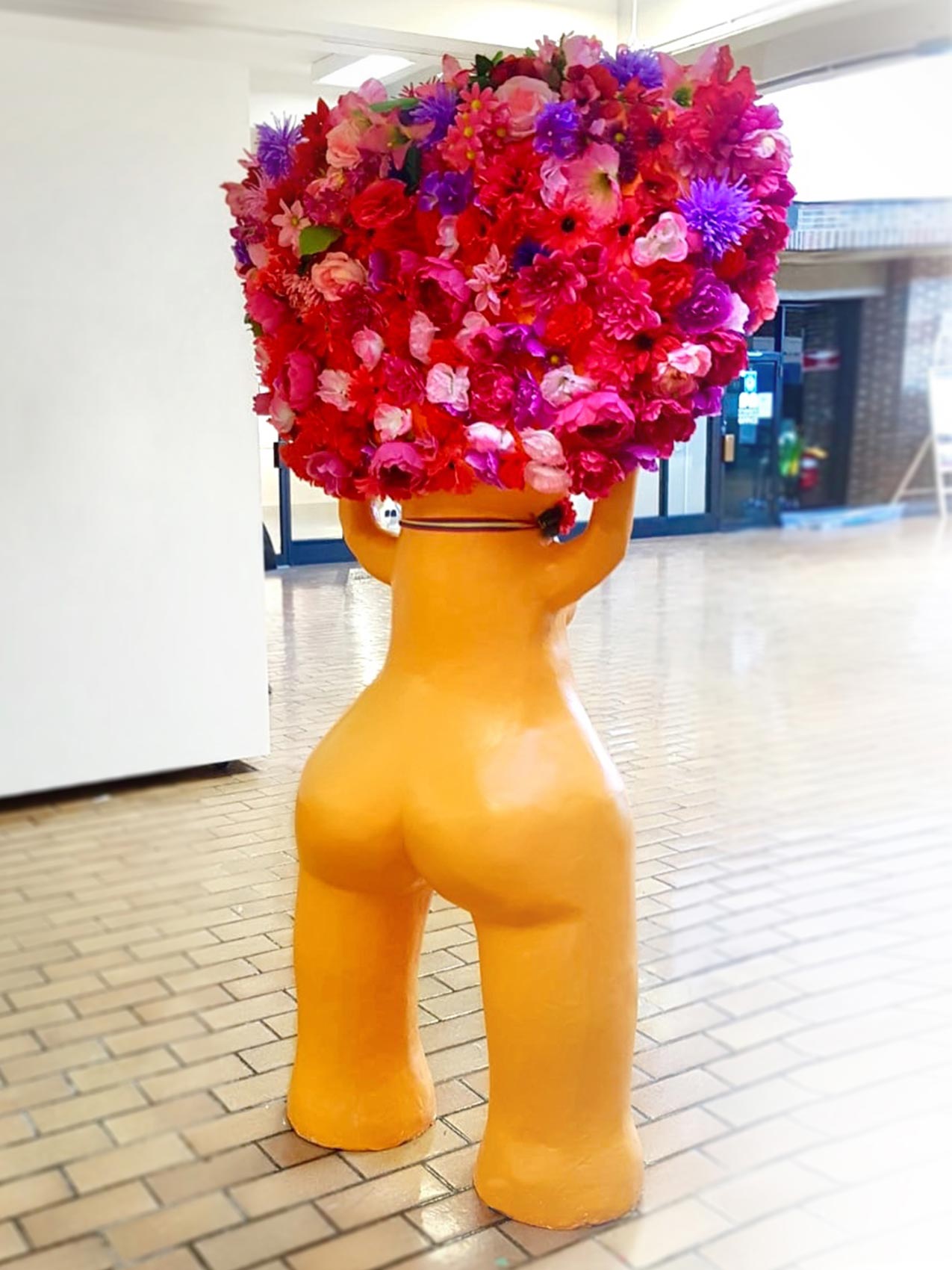 The vibrant flowers and yellow hue that envelop the surface of The (Re)Birth radiates warmth and vitality, serving as a beacon of hope amidst the shadows of colonial oppression. Adorned with over 500 faux flowers rescued from the garbage and gathered from thrift stores, the “Venus” becomes an unabashed cultural revival, each bloom a testament to the significance of finding value in the undervalued, forgotten, and discarded material objects in our lives.